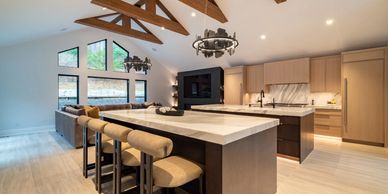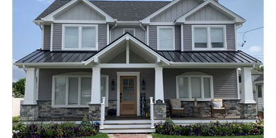 Beige two story big house with black trim and lawn and trees on a sunny day