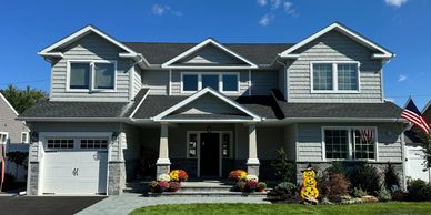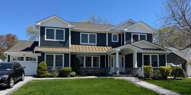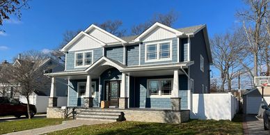 blue two story house with white windows and two cars in driveway on sunny day